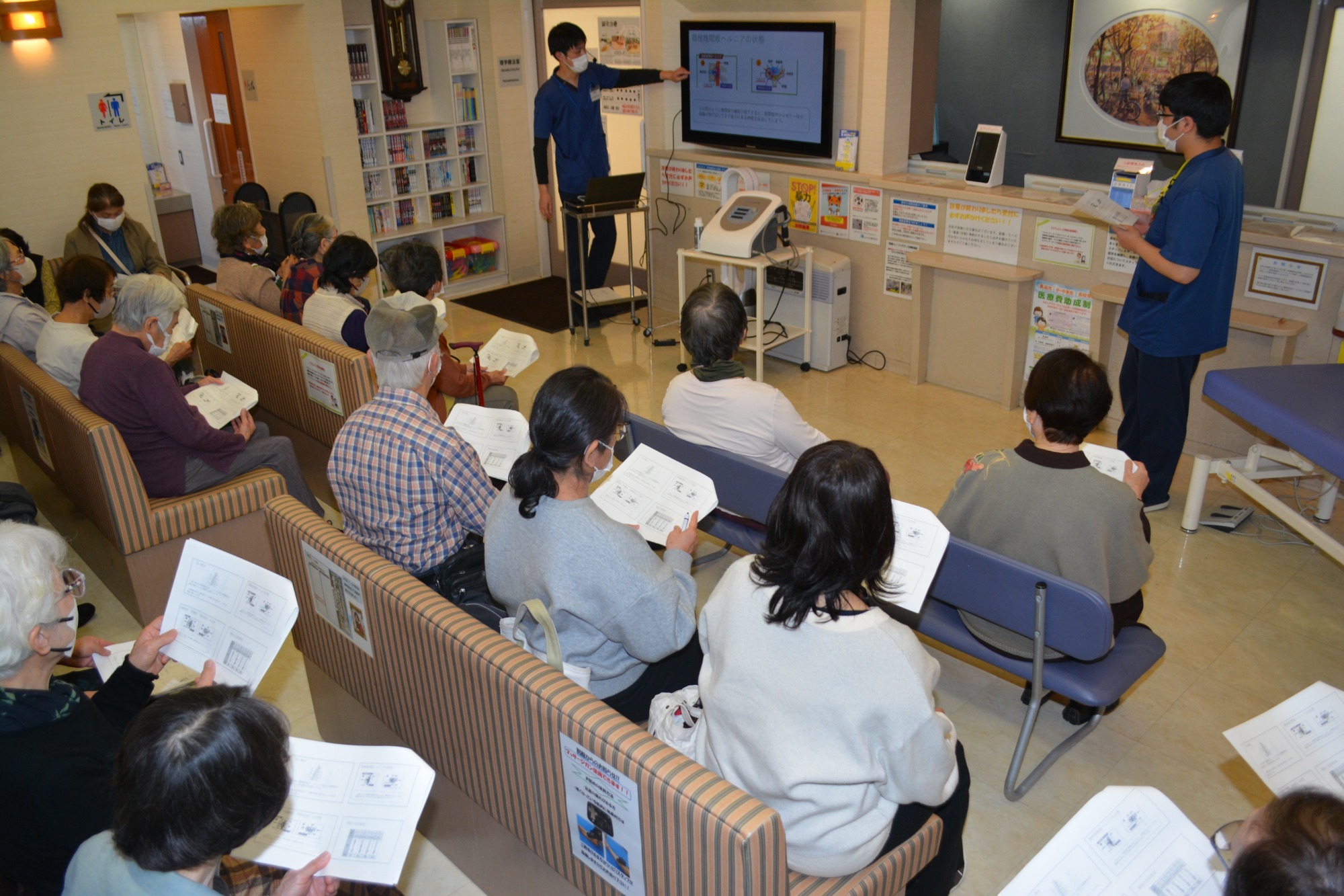 講習内では、体操の実演を交えて説明し、参加者からは今後の参考にしたい等のご意見を頂きました。当院では、腰痛が起こる前の予防から、症状の悪化予防まで状態に合わせて運動方法をご提示できるように日々研鑚に努めておりますので、お気軽に理学療法士にお尋ね下さい。