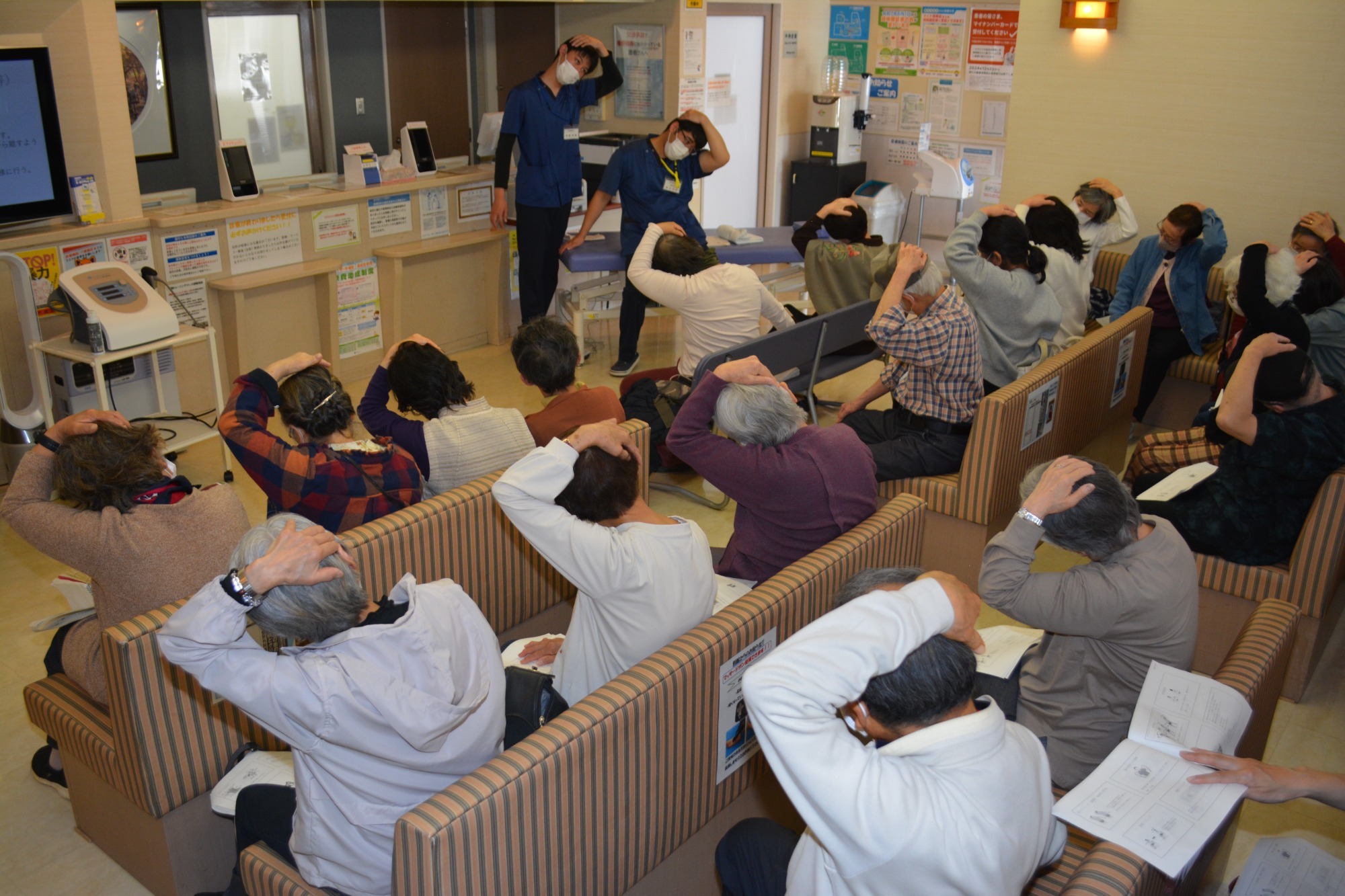 講習内では、高齢になるにつれ認知症のリスクが高まることや、それに伴うバランス能力低下の関連性を分かりやすく説明しました。予防体操では、参加者の方々も楽しみながら実施されていました。当院では、治療に加え予防運動の方法をご提示できるように日々研鑚に努めておりますので、お気軽に理学療法士にお尋ね下さい。