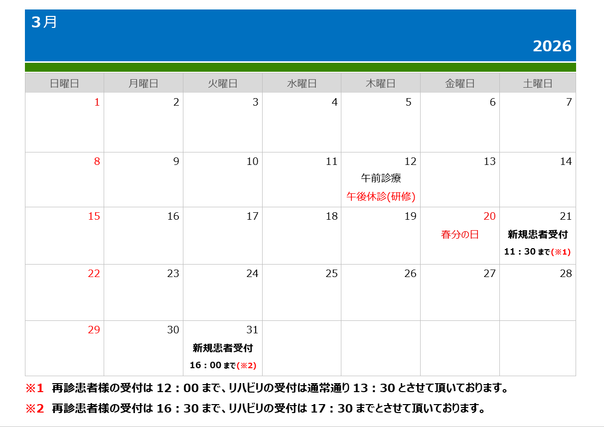 ※ 月曜日午後のリハビリをスポーツの方優先の外来とします。それ以外の午後のリハビリを、一般とスポーツの全般の外来とします。